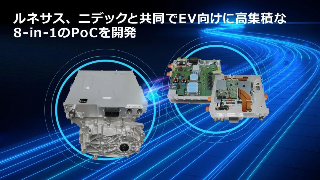 除了尼得科的電機和齒輪外,該PoC 還包括八項功能,分別是瑞薩電子的逆變器(輸出功率為70~100kW,最高效率超過99%)、1.5kW DC/DC 轉換器、6.6kW OBC、配電單元(PDU)、電池管理系統(BMS)和汽車正溫共效率(PTC)加熱控制器。
