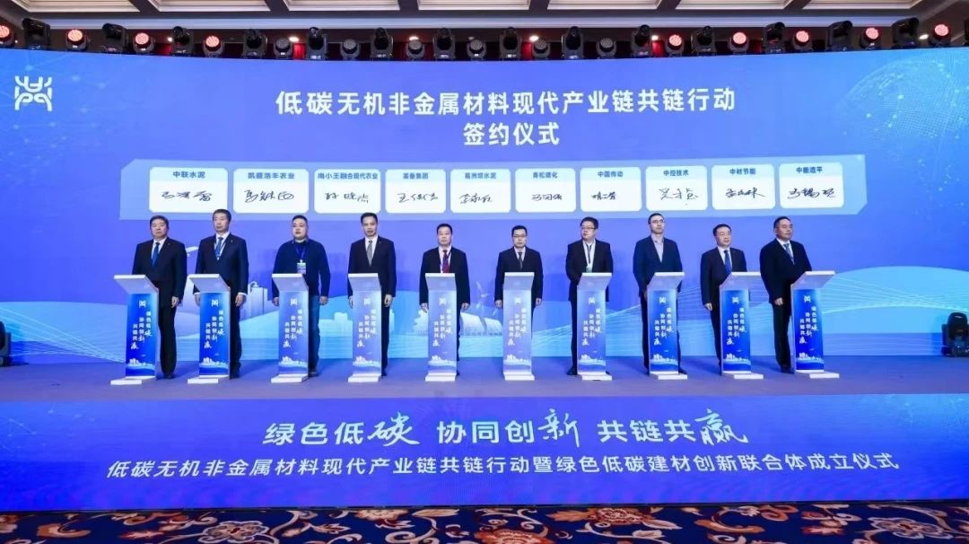 大會以“綠色低碳、協同創新、共鏈共贏”為主題,旨在共同探索產業鏈低碳發展新路徑,構建長期穩定、互利共贏的合作新機制。本次大會上,中國建材集團有限公司、中國建筑集團有限公司、安徽海螺水泥股份有限公司、福耀玻璃工業集團股份有限公司等15家聯合體共建單位共同舉行了低碳無機非金屬材料現代產業鏈共鏈行動啟動儀式。