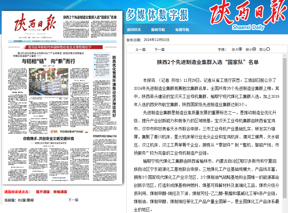11月29日,記者從省工信廳獲悉:工信部日前公示了2024年先進制造業集群競賽勝出集群名單,全國共有35個先進制造業集群上榜。其中,陜西牽頭建設的寶漢天工業母機集群、榆鄂寧現代煤化工集群入選。加上2019年入選的西安市航空集群,陜西國家級先進制造業集群達到3個。