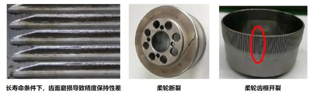 目前市場上諧波減速器存在精度差、壽命短、功率密度和剛性等難以達到客戶要求等問題。相關(guān)數(shù)據(jù)統(tǒng)計顯示,部分主打性價比的諧波減速器產(chǎn)品耐久度不夠,在10000小時壽命條件下,產(chǎn)品的可靠性與穩(wěn)定性方面問題頻發(fā),早期磨損嚴重導(dǎo)致短期運行后精度變差,齒面點蝕,柔輪斷裂、開裂的情況出現(xiàn)概率變高,品控難以保證。