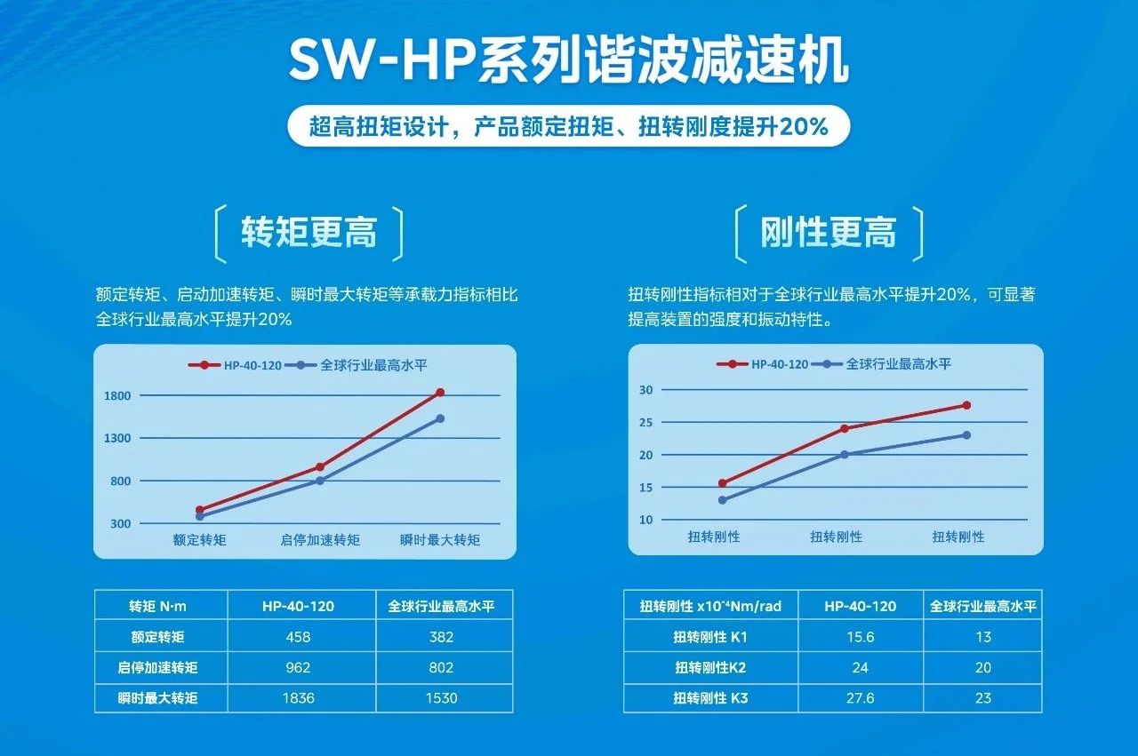 此外,今年美的工業(yè)技術(shù)發(fā)布的第二款諧波減速器新品為超高扭矩諧波減速器SW-HP系列。該諧波減速器在額定轉(zhuǎn)矩、啟動加速轉(zhuǎn)矩、瞬時最大轉(zhuǎn)矩、扭轉(zhuǎn)剛性等關(guān)鍵指標(biāo)上均實現(xiàn)了突破,領(lǐng)先行業(yè)最高水平約20%。