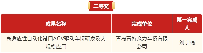 近日,山東省總工會公布了2024年度山東省職工創新創效競賽省級決賽擬授獎成果名單,經過層層選拔,由青特集團技術中心劉宗強作為第一完成人、公司自主正向開發的產品項目“高適應性自動化港口AGV驅動車橋研發及大規模應用”榮獲二等獎。為山東省乃至全國港口自動化碼頭的綠色低碳建設樹立了典范,為推動港口行業向智能化、環保型發展,構建智慧物流體系貢獻了青特力量。
