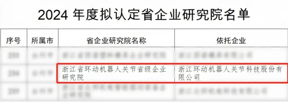 近日,浙江省經信廳公示了2024年度擬認定省企業研究院名單,浙江省環動機器人關節省級企業研究院(簡稱“環動研究院”)成功入選。這是對環動科研創新體系、技術開發能力以及研發團隊的充分肯定。