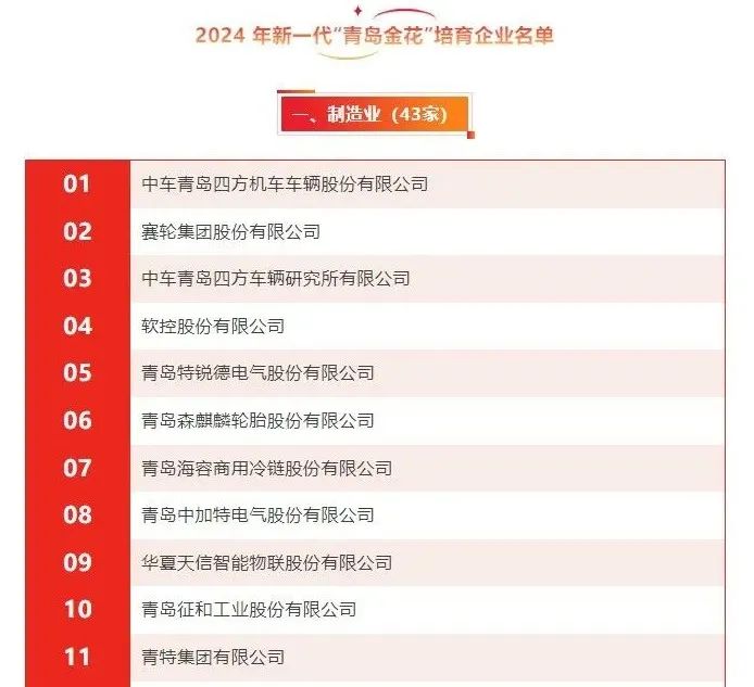 1月2日,青島市工業和信息化局、青島市發展和改革委員會、青島市農業農村局聯合發布《2024年新一代“青島金花”培育企業名單》,共計入選企業109家。青特集團憑借其在智能制造領域的持續創新和卓越表現,自2020年起連續5年入選該榜單。