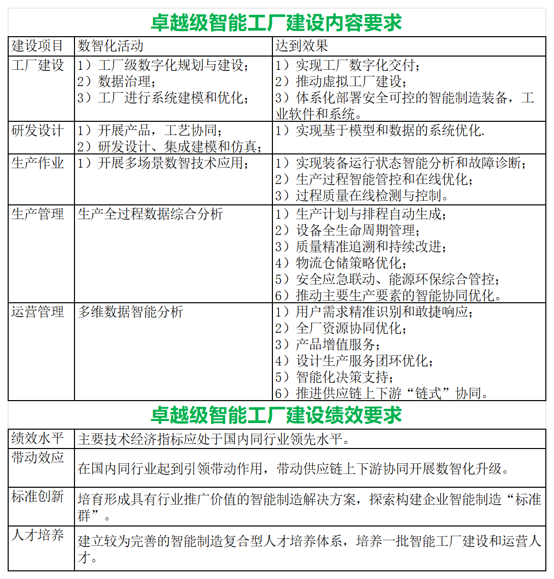 卓越級(jí)智能工廠要求智能制造成熟度達(dá)到模型達(dá)到3級(jí)及以上。建設(shè)內(nèi)容包括工廠建設(shè)、研發(fā)設(shè)計(jì)、生產(chǎn)作業(yè)、生產(chǎn)管理和運(yùn)營(yíng)管理五個(gè)方面的建設(shè)項(xiàng)目,8個(gè)數(shù)智化應(yīng)用場(chǎng)景,實(shí)現(xiàn)19項(xiàng)應(yīng)用效果,并在績(jī)效水平、產(chǎn)業(yè)鏈帶動(dòng)效益、標(biāo)準(zhǔn)建設(shè)和人才培養(yǎng)方面凸顯其卓越成效。