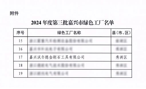 近日,嘉興市經濟和信息化局公布了“2024 年度第三批嘉興市綠色工廠名單”。嘉興沃爾德金剛石工具有限公司被認定為嘉興市綠色工廠。