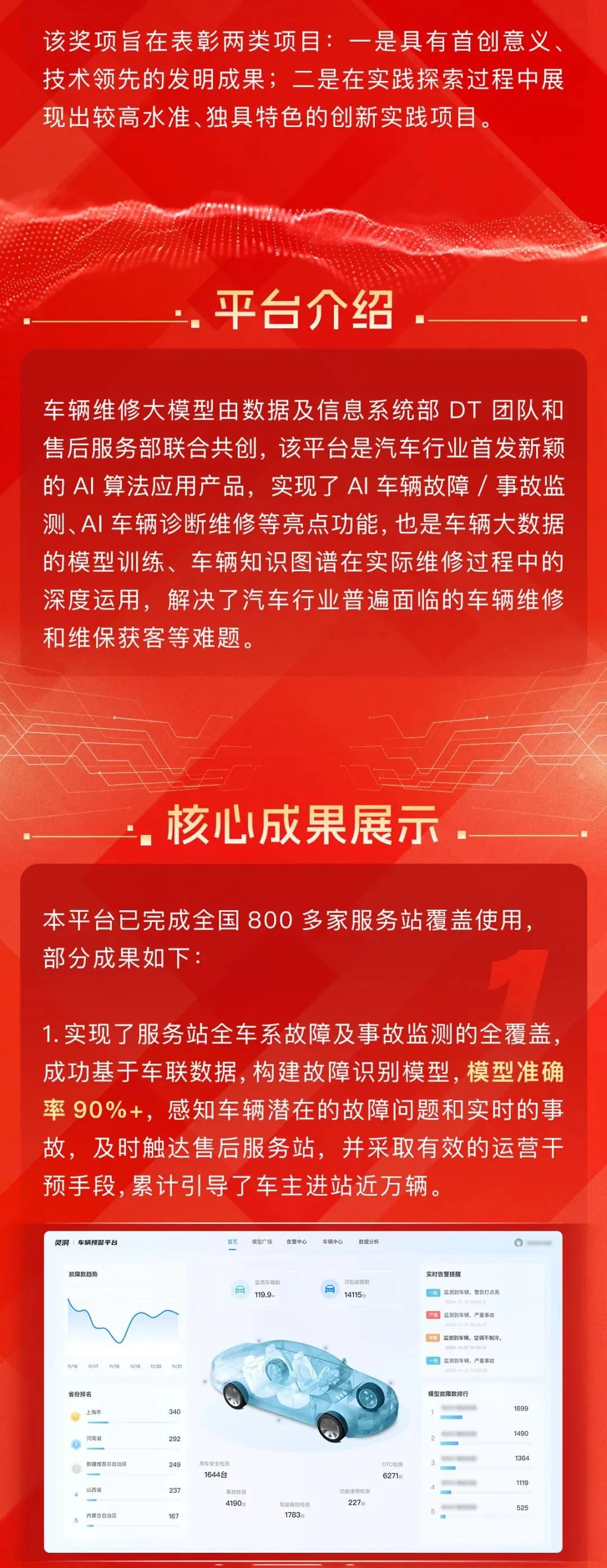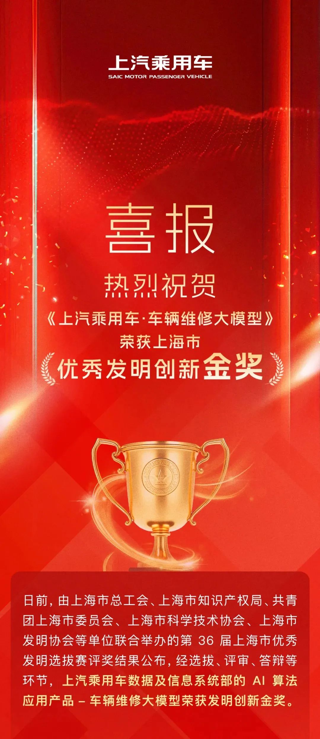 日前,由上海市總工會、上海市知識產權局、共青團上海市委員會、上海市科學技術協會、上海市發明協會等單位聯合舉辦的第 36屆上海市優秀發明選拔賽評獎結果公布,經選拔、評審、答辯等環節,上汽乘用車數據及信息系統部的 AI算法應用產品-車輛維修大模型榮獲發明創新金獎。
