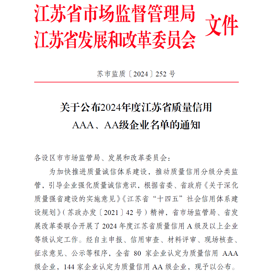 據悉,江蘇省質量信用企業等級認定工作是由江蘇省市場監管局和省發展改革委聯合組織開展的一項重點工作,企業質量信用等級共分為A、B、C、D四個等級,其中A級細分為A、AA、AAA三個級別,從規劃戰略部署、質量管理體系、質量保證能力、質量誠信意識和質量競爭優勢等十個方面對企業的質量信用進行綜合評估,其主要目的在于加快推進質量誠信體系建設,推動質量信用分級分類監管,引導企業強化質量誠信意識。