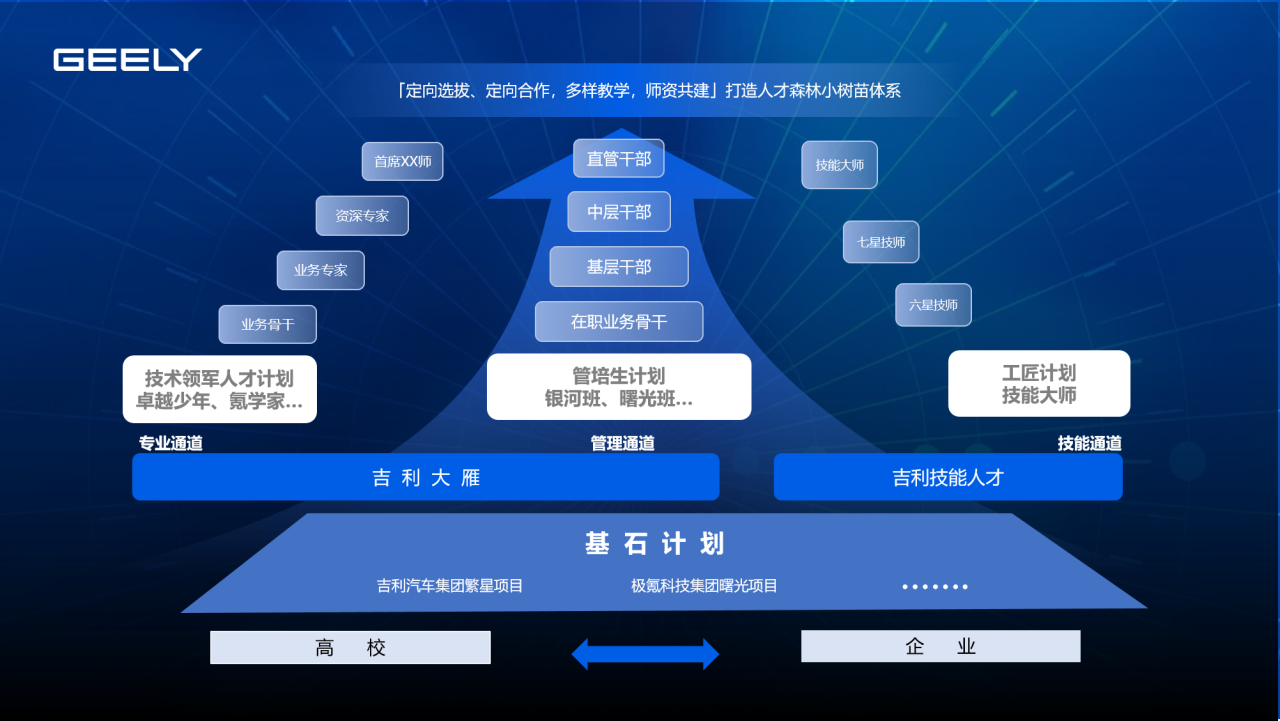 正是基于在產(chǎn)教融合、校企合作方面的前期耕耘和積淀,吉利正式啟動了全新進(jìn)階的人才培養(yǎng)體系——“基石計劃”。吉利控股集團(tuán)副總裁兼首席人力資源官潘雷方在主題分享中表示,“基石計劃是吉利面向未來產(chǎn)業(yè)變革的內(nèi)生型人才戰(zhàn)略工程,通過積極探索開放、共享的產(chǎn)教協(xié)同體系,推動產(chǎn)業(yè)與教育深度融合,與全球高校共同探索實踐‘千人千面’的教育模式,培育有共同商業(yè)理想的全球同路人扎根吉利,成為企業(yè)發(fā)展的堅固基石,促進(jìn)吉利人才森林蓬勃發(fā)展。”
