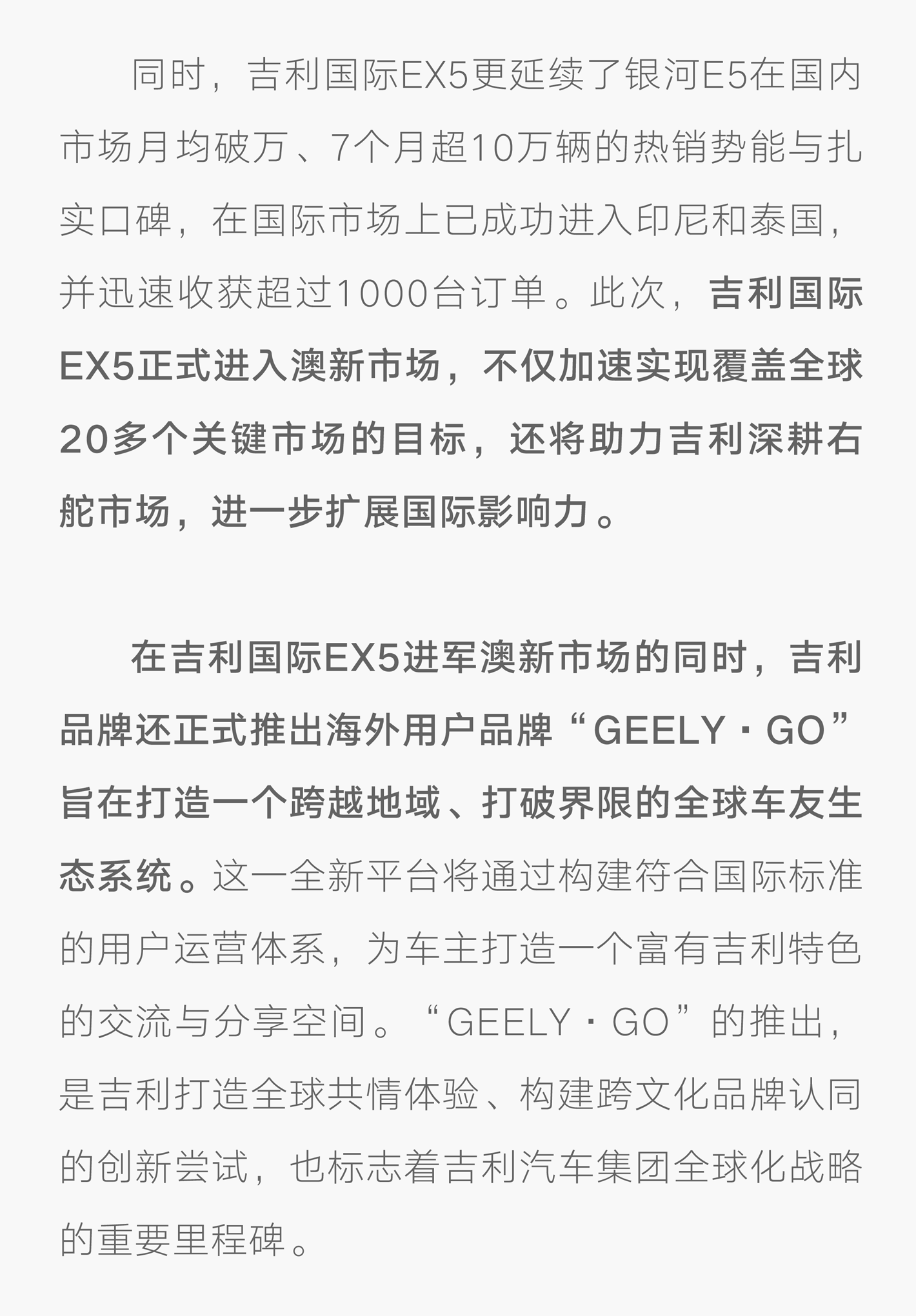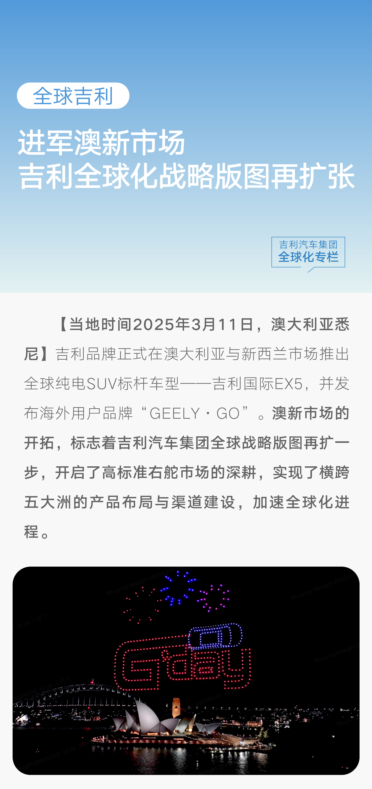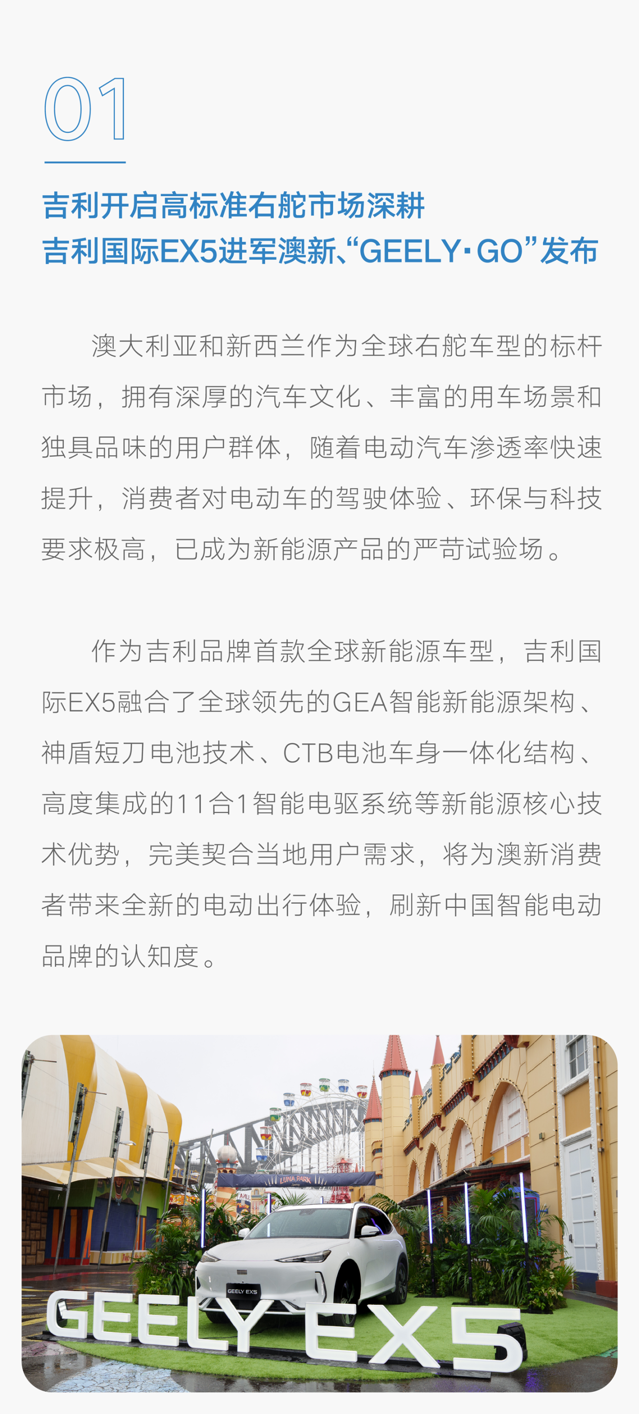 【當地時間2025年3月11日,澳大利亞悉尼]吉利品牌正式在澳大利亞與新西蘭市場推出全球純電SUV標桿車型一一吉利國際EX5,并發布海外用戶品牌“GEELY·GO”。
