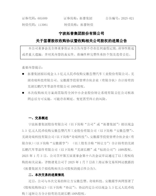 公告稱,近日,公司與本次交易的轉讓方安徽岳塑、奇瑞科技、安徽源享共同簽署了《股權收購協議》(以下簡稱“協議”),協議約定公司以現金3.3億元人民幣收購上述轉讓方合計持有的蕪湖長鵬100%股權。