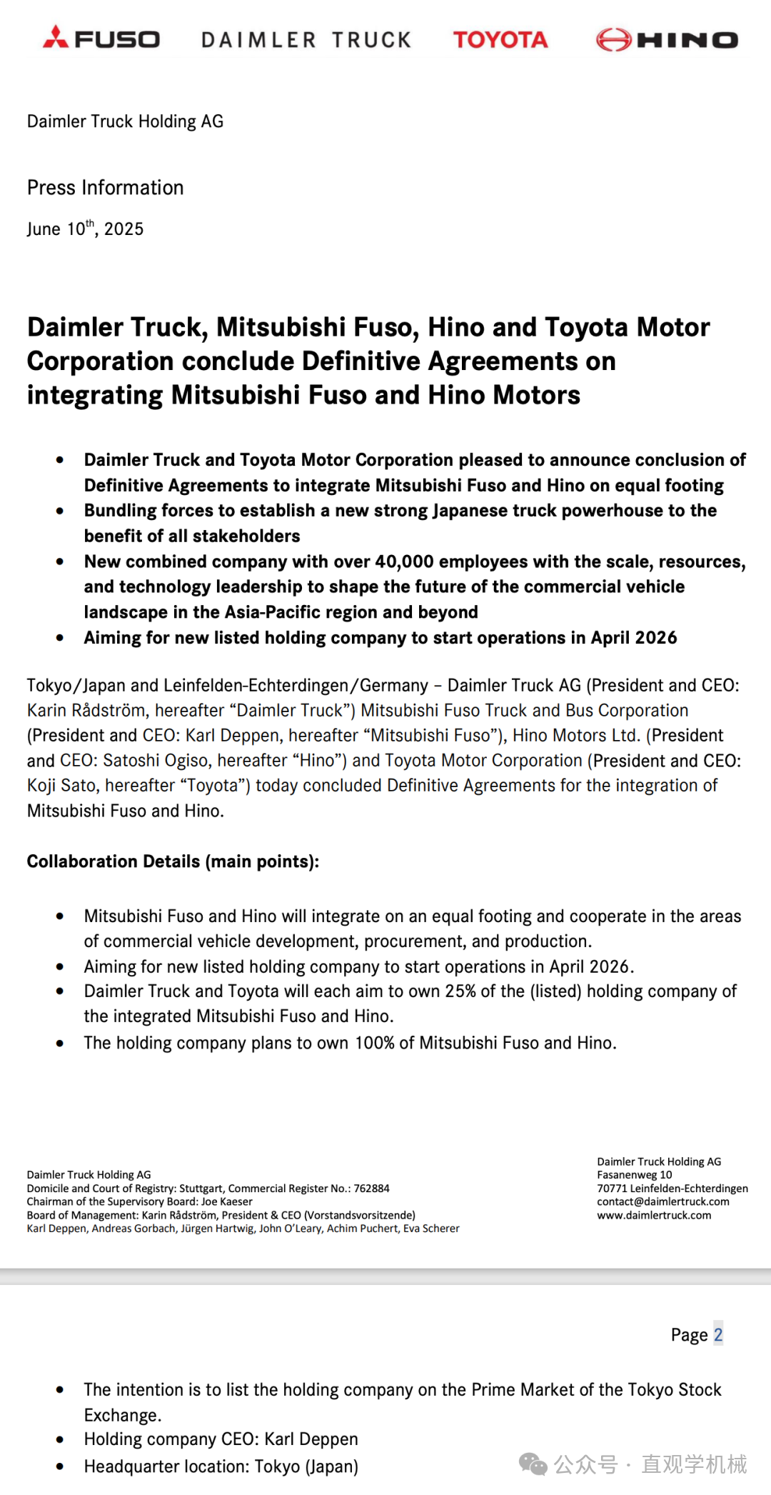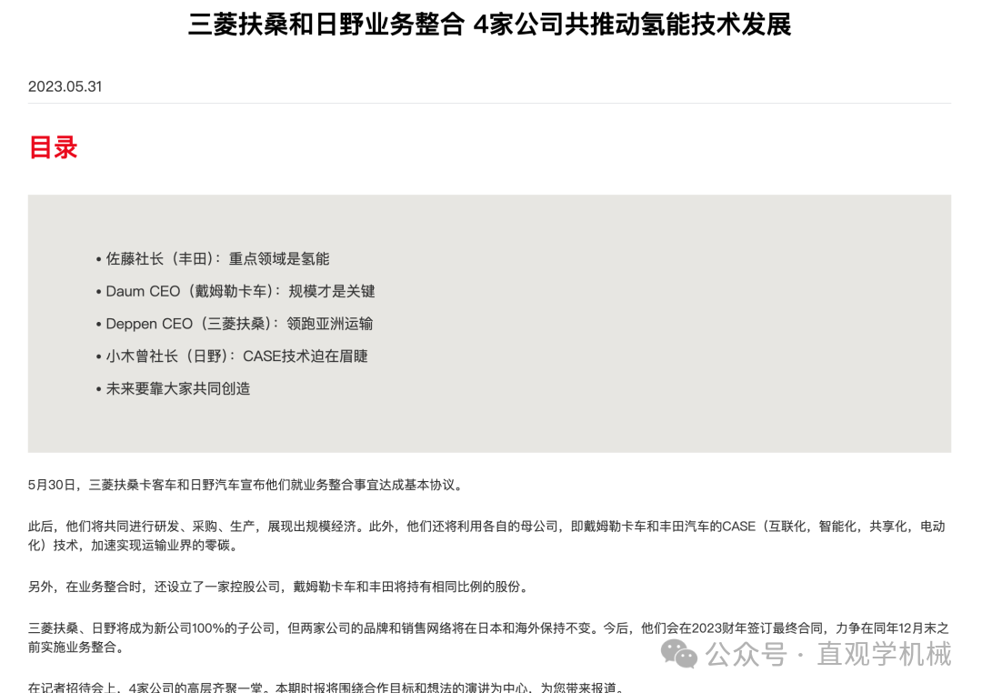其實,早在2023年5月,豐田、日野汽車、戴姆勒卡車、三菱扶桑4家公司就2024年底之前統(tǒng)合業(yè)務(wù)達成基本協(xié)議。然而,原本計劃在2024年2月簽署最終協(xié)議,卻因為日野汽車的發(fā)動機認證造假一事不得不被迫無限期推遲,時間來到2025年,事情出現(xiàn)轉(zhuǎn)機,雙方重啟合并談判,4月份的時候多家日媒就透露豐田、日野汽車、戴姆勒卡車、三菱扶桑就業(yè)務(wù)整合基本確定,并最早有望在5月簽署最終協(xié)議,雖然最終時間遲了一個月,但總算是定了下來。