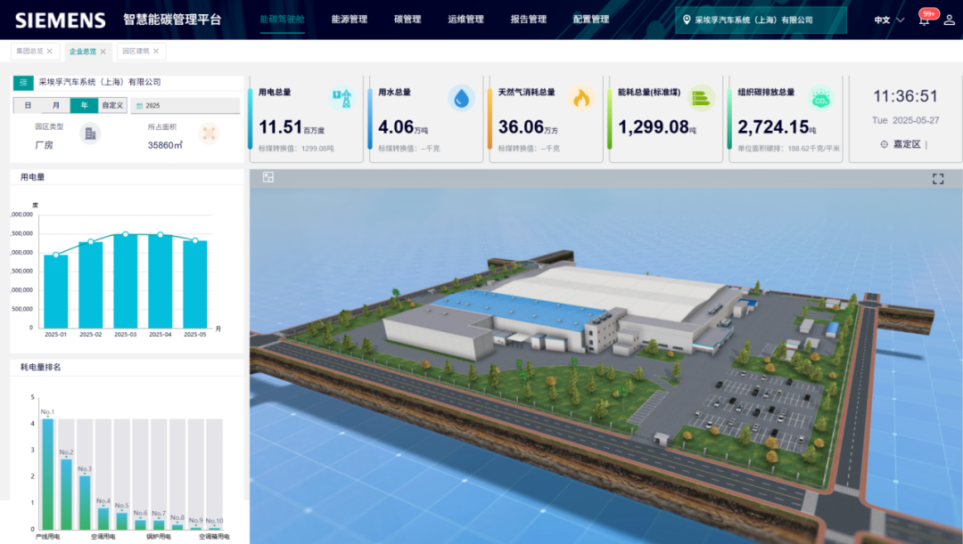 傳統(tǒng)的廠區(qū)能耗管理模式多依賴人工,需借助能耗巡查員手動錄入數(shù)據(jù),效率較低且無法實(shí)現(xiàn)實(shí)時監(jiān)控。為了讓工廠完成數(shù)智化蛻變,西門子借助智慧能碳管理平臺 Smart ECX 將物聯(lián)網(wǎng)、云計(jì)算、大數(shù)據(jù)和人工智能等技術(shù)融合,嵌入 3D 建模,構(gòu)建出能源數(shù)字孿生。整個廠區(qū)以 3D 動畫的形式進(jìn)行完整展現(xiàn),對工廠的日常耗能、產(chǎn)線用能等進(jìn)行實(shí)時采集、存儲和分析。這一系列功能,不僅直觀了解能源系統(tǒng)運(yùn)行態(tài)勢,讓生產(chǎn)數(shù)據(jù)和能耗數(shù)據(jù)有效融合,讓計(jì)算單品能耗成為可能,更能基于能源復(fù)合預(yù)測,幫助工廠的能源采購和排產(chǎn)進(jìn)行決策參考,進(jìn)行碳盤查便于未來制定減碳計(jì)劃。