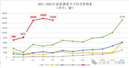 從銷量走勢來看,2025年新能源重卡銷量遠超去年同期,開局便保持高起點增長。3月到5月銷量均突破1.5萬輛,不斷打破同期歷史記錄。至此新能源重卡月增態(tài)勢擴大至“28連增”,是推動行業(yè)向新向綠轉換的重要推動力。