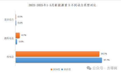 從新能源重卡動力類型來看,純電動及混動占比較去年有所提升。1-5月份,純電動重卡銷量5.9萬輛,結構占比為97.7%,較2024年增長3%。