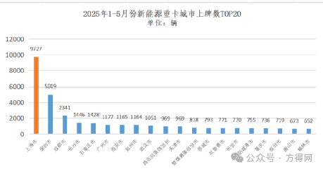 從城市1-5月份上牌數(shù)可見,上海市在新能源重卡城市上牌數(shù)9727,排名中依然保持斷崖領先。深圳市緊接其次,累銷5019。成都市累銷2341,長沙、石家莊等城市上牌數(shù)均在千輛以上。