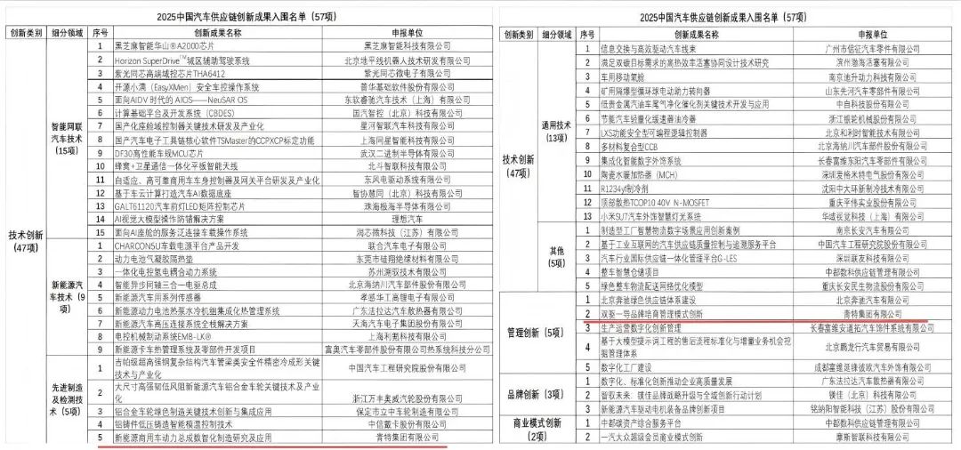 據(jù)了解,2025中國汽車供應(yīng)鏈優(yōu)秀創(chuàng)新成果評選,在汽車產(chǎn)業(yè)鏈上下游共有57個創(chuàng)新項目入圍。中國汽車工業(yè)協(xié)會自2021年起在行業(yè)內(nèi)組織開展了“中國汽車供應(yīng)鏈創(chuàng)新成果推薦”工作。截至2024年,已經(jīng)累計推薦創(chuàng)新成果項目156項。5年來,“中國汽車供應(yīng)鏈創(chuàng)新成果”以其典型性、先進性和權(quán)威性,具有“風(fēng)向標(biāo)”的指引作用,展示了每年國內(nèi)供應(yīng)鏈領(lǐng)域的最新突破和豐碩成果,有力地促進科技成果落地轉(zhuǎn)化和產(chǎn)業(yè)化對接。