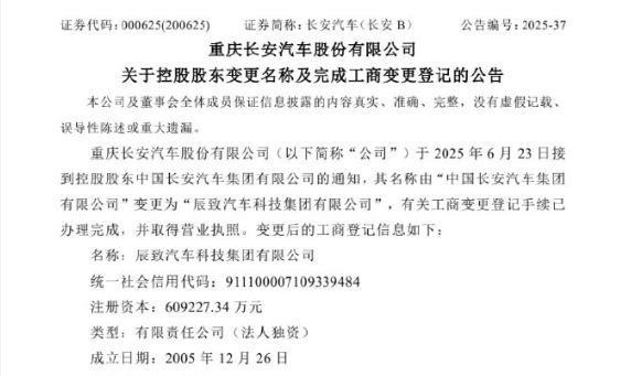 昨天,長安汽車公告稱,公司接到控股股東中國長安汽車集團有限公司通知,其名稱由“中國長安汽車集團有限公司”變更為“辰致汽車科技集團有限公司”,目前已完成工商變更登記手續(xù)。