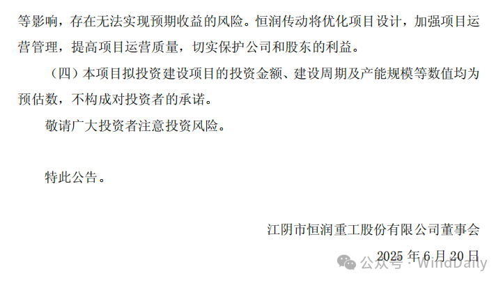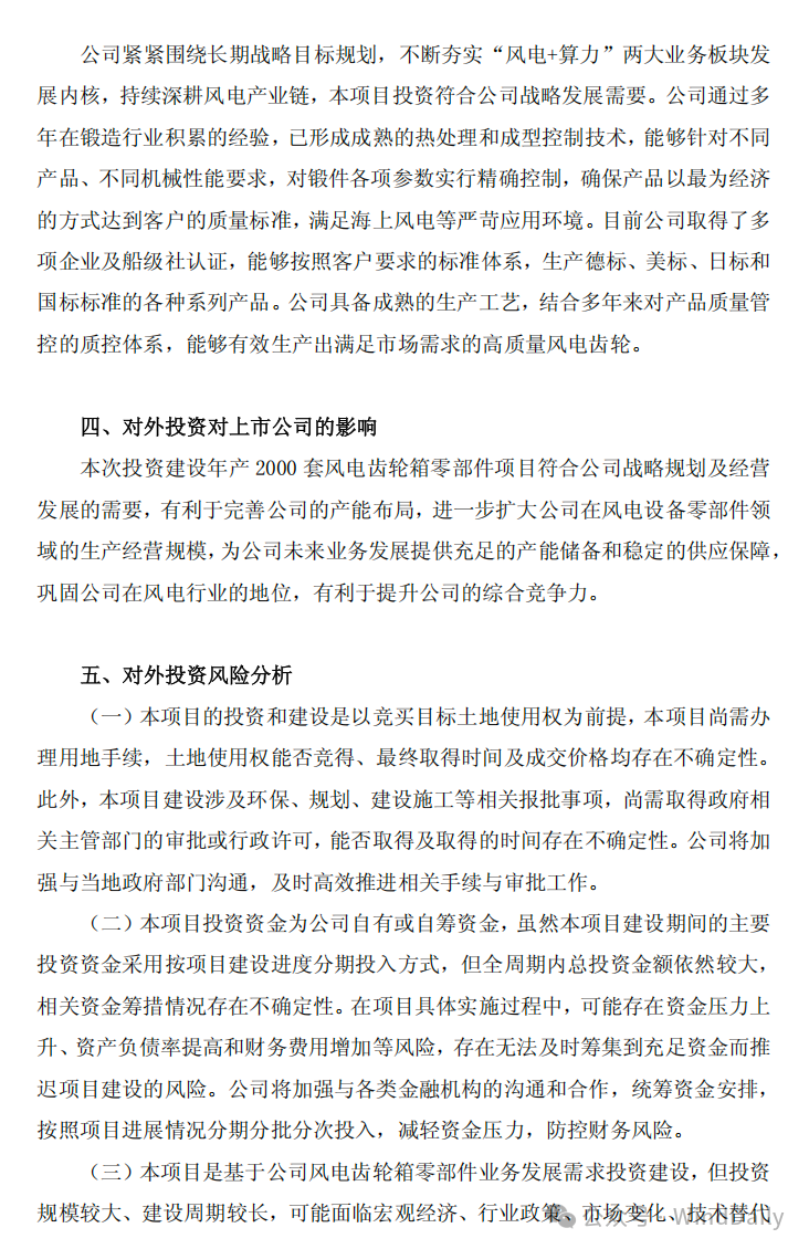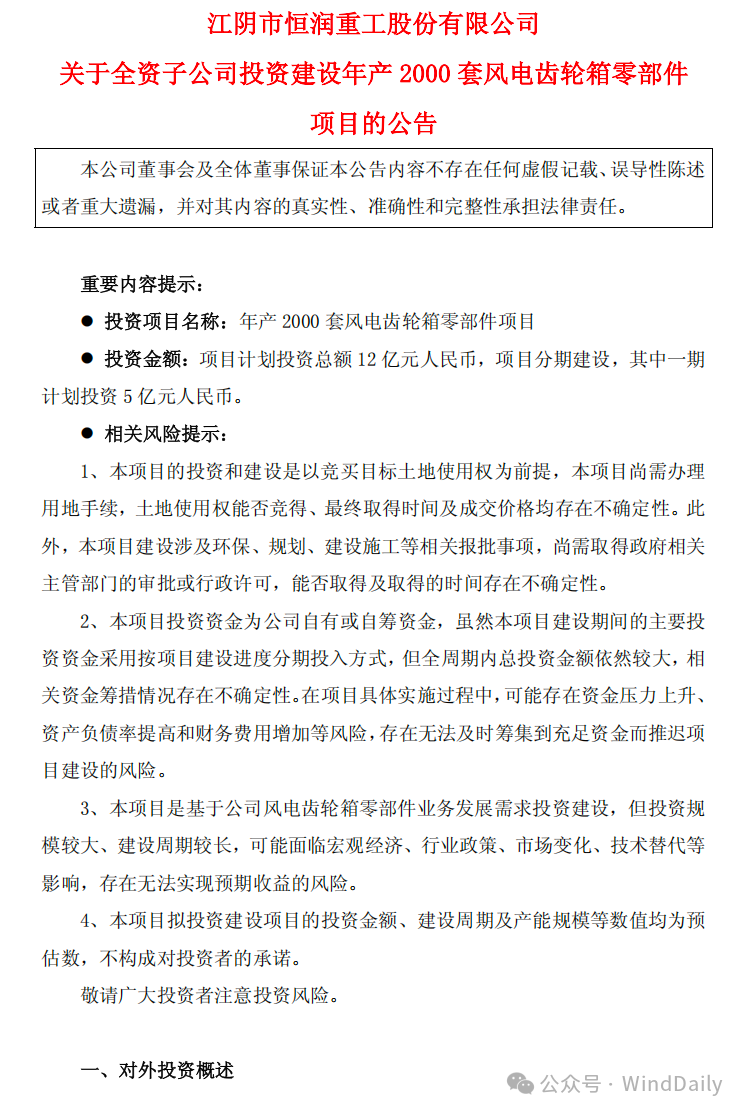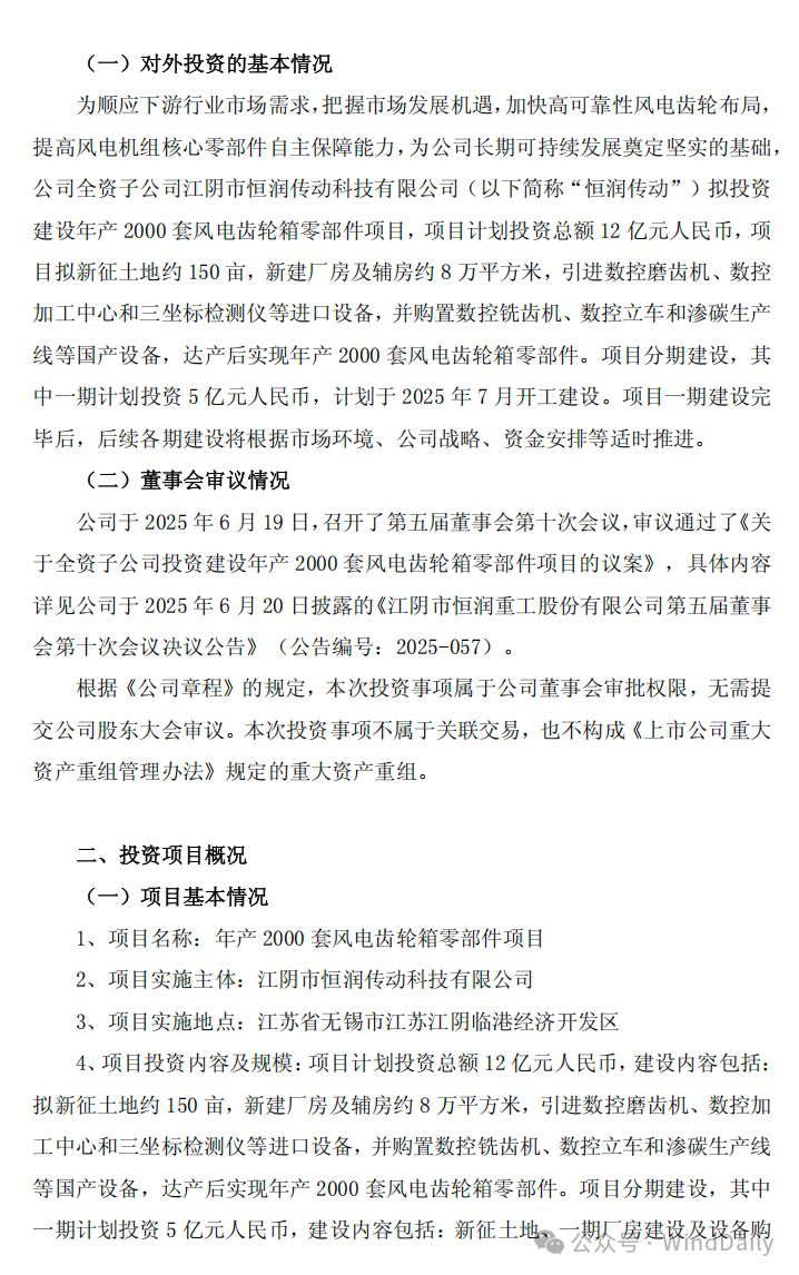 WindDaily獲悉,恒潤(rùn)股份近日宣布全資子公司江陰市恒潤(rùn)傳動(dòng)科技有限公司擬投資建設(shè)該項(xiàng)目,計(jì)劃投資總額12億元。項(xiàng)目擬新征土地約150畝,新建廠房及輔房約8萬(wàn)平方米,引進(jìn)進(jìn)口設(shè)備并購(gòu)置國(guó)產(chǎn)設(shè)備,達(dá)產(chǎn)后實(shí)現(xiàn)年產(chǎn)2000套風(fēng)電齒輪箱零部件。項(xiàng)目分期建設(shè),一期計(jì)劃投資5億元,將于2025年7月開工建設(shè)。詳情如下: