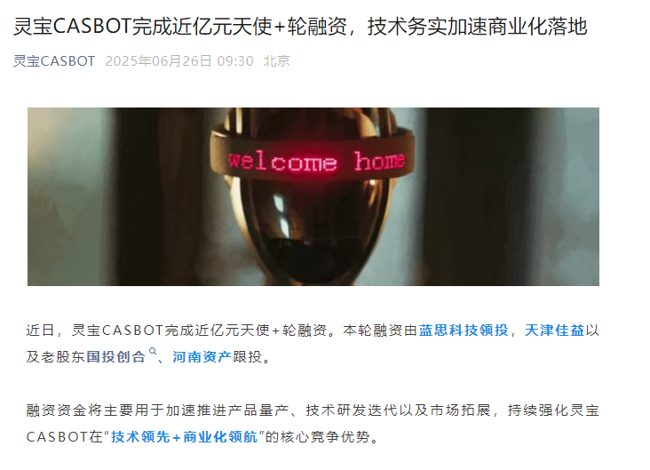 6月26日消息,靈寶CASBOT(北京中科慧靈機器人技術有限公司)宣布,完成近億元天使+輪融資,由藍思科技領投,天津佳益以及老股東國投創合、河南資產跟投。所募集資金將主要用于加速推進產品量產、技術研發迭代以及市場拓展,持續強化靈寶CASBOT在“技術領先+商業化領航”的核心競爭優勢。