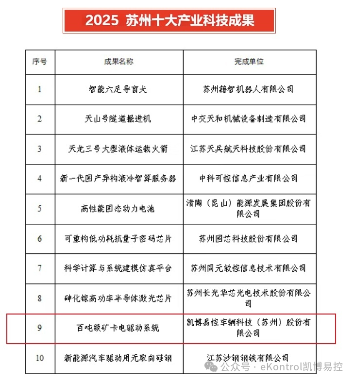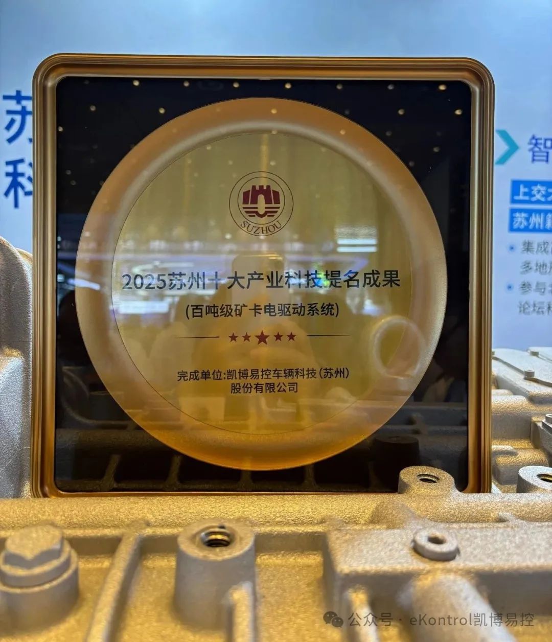 在7 月10 日舉行的2025高校技術轉移轉化大會暨第二屆蘇州國際科創大會上,“2025 蘇州十大產業科技成果”名單正式發布,凱博易控“百噸級礦卡電驅動系統”榮耀上榜。