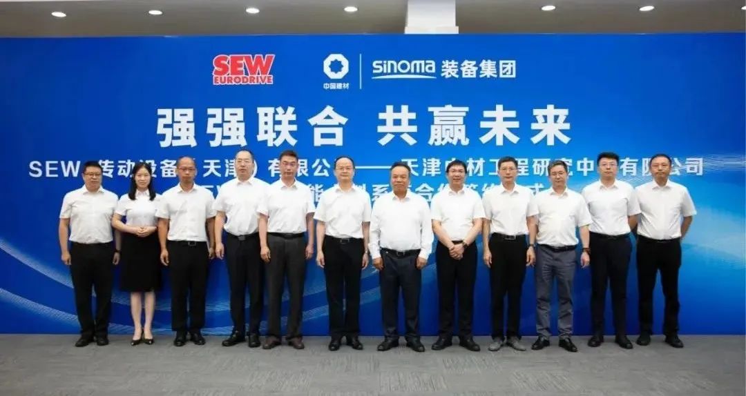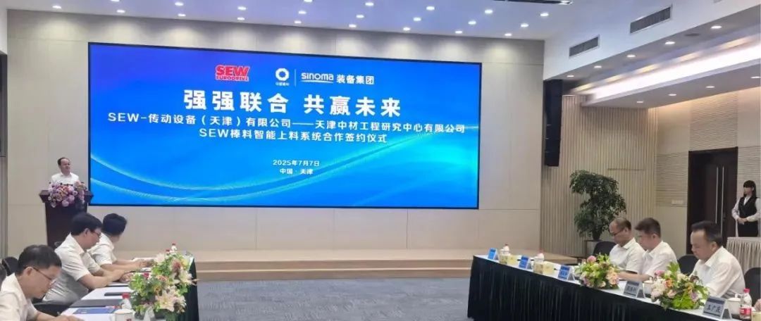 7月7日,裝備集團所屬天津中材工程研究中心有限公司(簡稱工程研究中心)與SEW-傳動設備(天津)有限公司舉行SEW棒料智能上料系統項目簽約儀式。中材國際副總裁、裝備集團董事長何小龍,SEW-中國集團公司執行董事長張勝利,裝備集團副總經理范道榮、SEW-傳動設備(天津)有限公司常務副總經理高瓊華等出席簽約儀式。