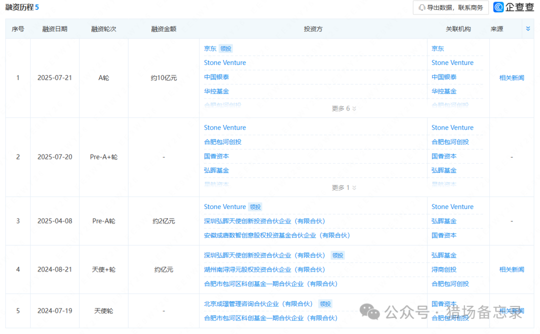 至此,公司已累計(jì)完成5輪融資,上一次融資可追溯到2025年4月,完成由中東資本Stone Venture領(lǐng)投,一眾老股東跟投的約2億元Pre-A輪融資;早期融資還包括,于2024年7月19日、8月21日,完成天使輪、天使+輪兩輪共計(jì)近億元融資;天使輪由商湯國(guó)香資本領(lǐng)投、合肥濱湖金跟投;天使輪+輪由弘暉基金領(lǐng)投、潯商資本、合肥濱湖金投跟投。