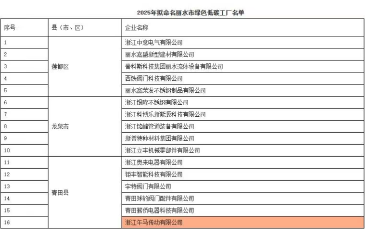2025年7月,麗水市經濟和信息化局發布《關于擬認定2025年市級綠色低碳工廠名單的公示》,浙江午馬傳動有限公司經企業申報、專家評審等程序,成功入選擬認定名單。此次評選依據《麗水市經濟和信息化局關于開展2025年市級綠色低碳工業園區、工廠申報及動態管理的通知》(麗經信綠色〔2025〕3號)及《浙江省綠色低碳工業園區、工廠建設評價導則(2024版)》(浙經信綠色〔2024〕104號)等文件要求,重點考察企業在用地集約化、能源低碳化、生產潔凈化等方面的表現。