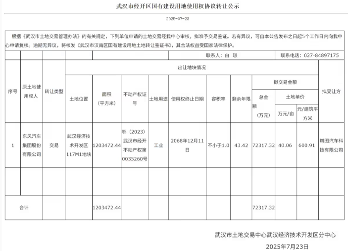 7月30日消息,武漢經開區7月23日公示顯示,嵐圖汽車正式以7.23億元完成對東風云峰汽車工廠的收購。