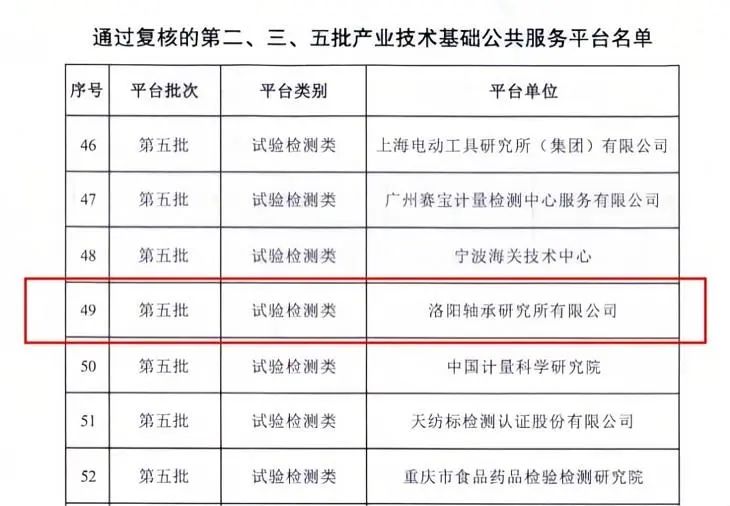 近日,《工業(yè)和信息化部辦公廳關(guān)于公布通過(guò)復(fù)核的第二、三、五批產(chǎn)業(yè)技術(shù)基礎(chǔ)公共服務(wù)平臺(tái)名單的通知》(工信廳科函〔2025〕259號(hào))發(fā)布,國(guó)機(jī)精工下屬企業(yè)洛陽(yáng)軸承研究所有限公司順利通過(guò)國(guó)家產(chǎn)業(yè)技術(shù)基礎(chǔ)公共服務(wù)平臺(tái)復(fù)核。