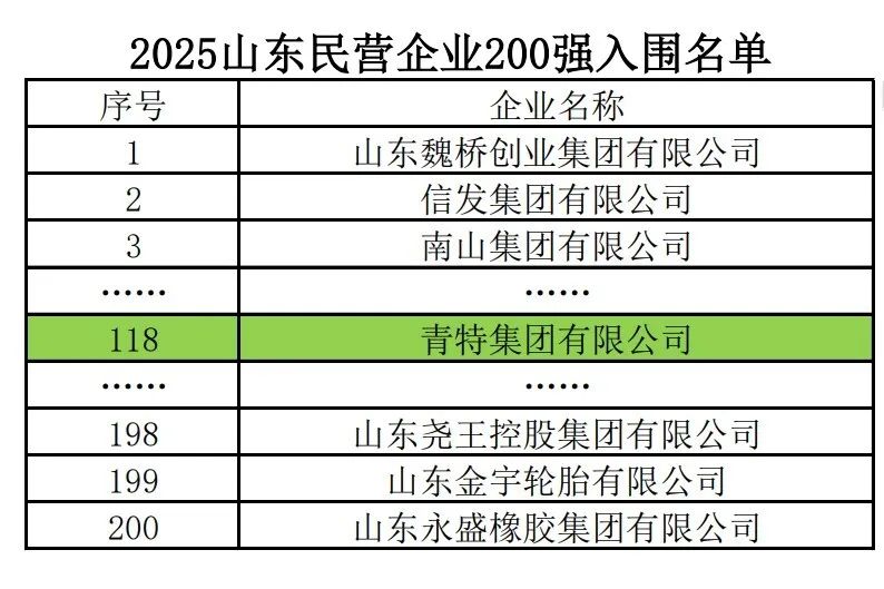 8月11日,山東省工商聯聯合省發展改革委、省科技廳等九部門共同發布“2025山東民營企業200強”榜單,青特集團有限公司以第118位的排名再次入圍榜單。這份榜單不僅是企業規模的見證,更是對青特集團持續創新與高質量發展的權威認可。
