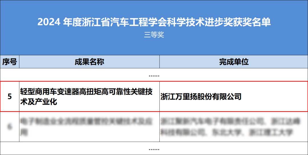 近日,2024年度浙江省汽車工程學會科學技術進步獎評選結果揭曉,萬里揚"輕型商用車變速器高扭矩高可靠性關鍵技術及產業化"項目榮膺三等獎。