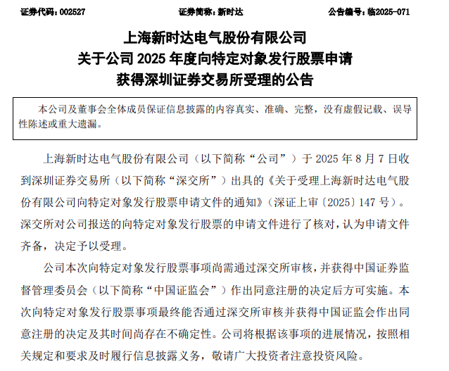 近日,上海新時達(dá)電氣股份有限公司(以下簡稱“新時達(dá)”)公告稱,2025年度向特定對象發(fā)行股票申請獲得深圳證券交易所受理。
