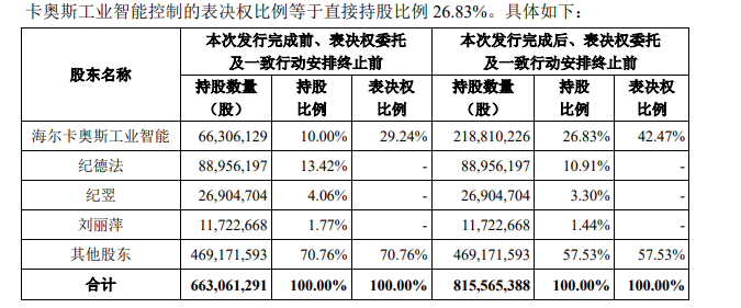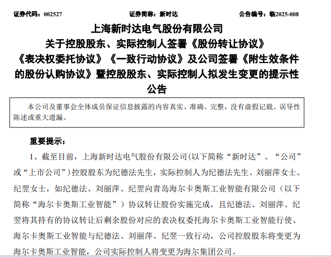 具體而言,新時達(dá)三大股東紀(jì)德法、劉麗萍、紀(jì)翌與海爾卡奧斯工業(yè)智能簽署了一攬子協(xié)議。三人分別將其持有新時代的29,652,066股股份、27,685,828股股份和8,968,235股股份轉(zhuǎn)讓給海爾卡奧斯工業(yè)智能,同時將合計所持上市公司剩余127,583,569股股份的表決權(quán)委托給海爾卡奧斯工業(yè)智能行使,且三人與海爾卡奧斯工業(yè)智能為一致行動關(guān)系。