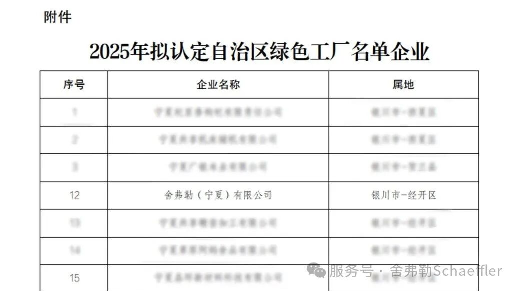 日前,寧夏回族自治區(qū)工信廳公布了2025年擬認(rèn)定自治區(qū)綠色工廠企業(yè)名單,舍弗勒銀川生產(chǎn)基地榜上有名,榮獲“自治區(qū)綠色工廠”稱號(hào)。這充分說明銀川基地堅(jiān)持綠色低碳發(fā)展道路,認(rèn)可了其在節(jié)能環(huán)保、資源利用、綠色管理等方面取得的顯著成果。