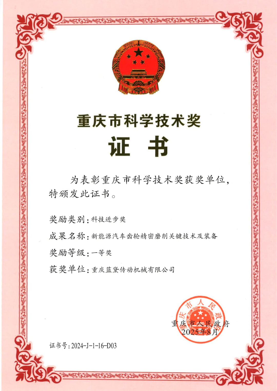 近日,在隆重召開的重慶市科技創(chuàng)新大會(huì)上,重慶市人民政府發(fā)布2024年度重慶市科學(xué)技術(shù)獎(jiǎng)勵(lì)決定,重慶藍(lán)黛傳動(dòng)機(jī)械有限公司參研的“新能源汽車齒輪精密磨削關(guān)鍵技術(shù)及裝備”項(xiàng)目,因在突破行業(yè)技術(shù)壁壘、支撐產(chǎn)業(yè)鏈自主可控方面的貢獻(xiàn)卓越,成功榮獲2024年度重慶市科技進(jìn)步獎(jiǎng)一等獎(jiǎng)。
