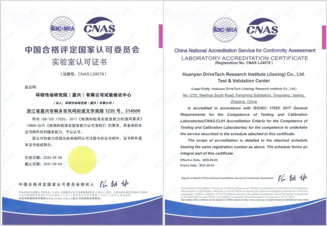 近日,雙環傳動子公司環研傳動研究院(嘉興)有限公司的(簡稱“雙環研究院”)試驗驗證中心正式通過中國合格評定國家認可委員會(CNAS)的評審,獲得 CNAS 實驗室認可證書(認可編號:CNAS L24078)。這是對雙環研究院試驗驗證中心技術實力、檢測能力、管理體系、設備設施等綜合實力的充分肯定,標志著研究院試驗驗證中心躋身國家認可實驗室行列,為雙環傳動在高端制造領域的技術能力建設再添重要支撐。