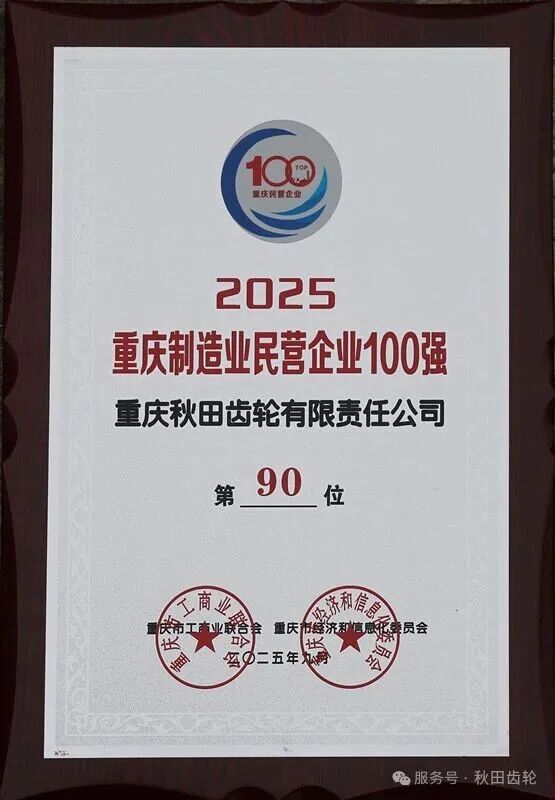 近日,市工商聯、市發改委、市經信委聯合發布“2025重慶制造業民營企業100強”榜單,重慶秋田齒輪有限責任公司憑借穩健的經營指標、領先的智能制造水平和突出的產業鏈帶動能力,連續五年入圍重慶制造業民營企業100強。
