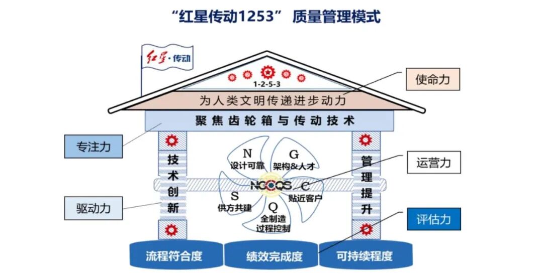 南高齒此次能斬獲榮譽(yù),核心在于其獨(dú)創(chuàng)的 “紅星傳動 1253” 質(zhì)量管理模式 —— 這也是大會關(guān)注的焦點(diǎn)亮點(diǎn)。該模式以企業(yè)戰(zhàn)略定位為指引,構(gòu)建 “技術(shù)創(chuàng)新 + 管理提升” 雙輪驅(qū)動體系,搭建起以客戶為中心的 NGCQS 大質(zhì)量管理運(yùn)營平臺,最終形成覆蓋產(chǎn)品全生命周期的閉環(huán)質(zhì)量管控體系。