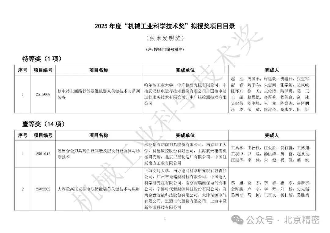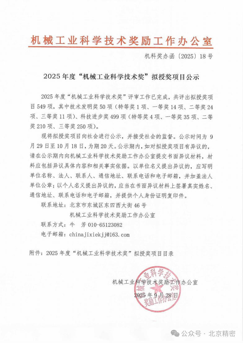 2025年度“機械工業科學技術獎”評審工作已完成,共評出擬授獎項目549項,其中技術發明獎50項(特等獎1項、一等獎14項、二等獎24項、三等獎11項)、科技進步獎499項(特等獎4項、一等獎35項、二等獎210項、三等獎250項)。