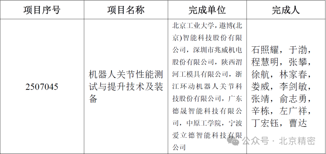 2025 年 10 月 23日,2025年度“機械工業科學技術獎”正式公布。北京工業大學石照耀教授團隊牽頭,邀博(北京)智能科技股份有限公司、深圳市兆威機電股份有限公司等單位參與的“機器人關節性能測試與提升技術及裝備”項目脫穎而出,獲評技術發明獎一等獎。這是機械工業領域首個機器人關節科技發明獎。機械工業科學技術獎是經國家科學技術部批準,由中國機械工業聯合會和中國機械工程學會共同設立,并根據有關規定,在國家科技獎勵主管部門登記的面向全國機械行業的綜合性科技獎項。