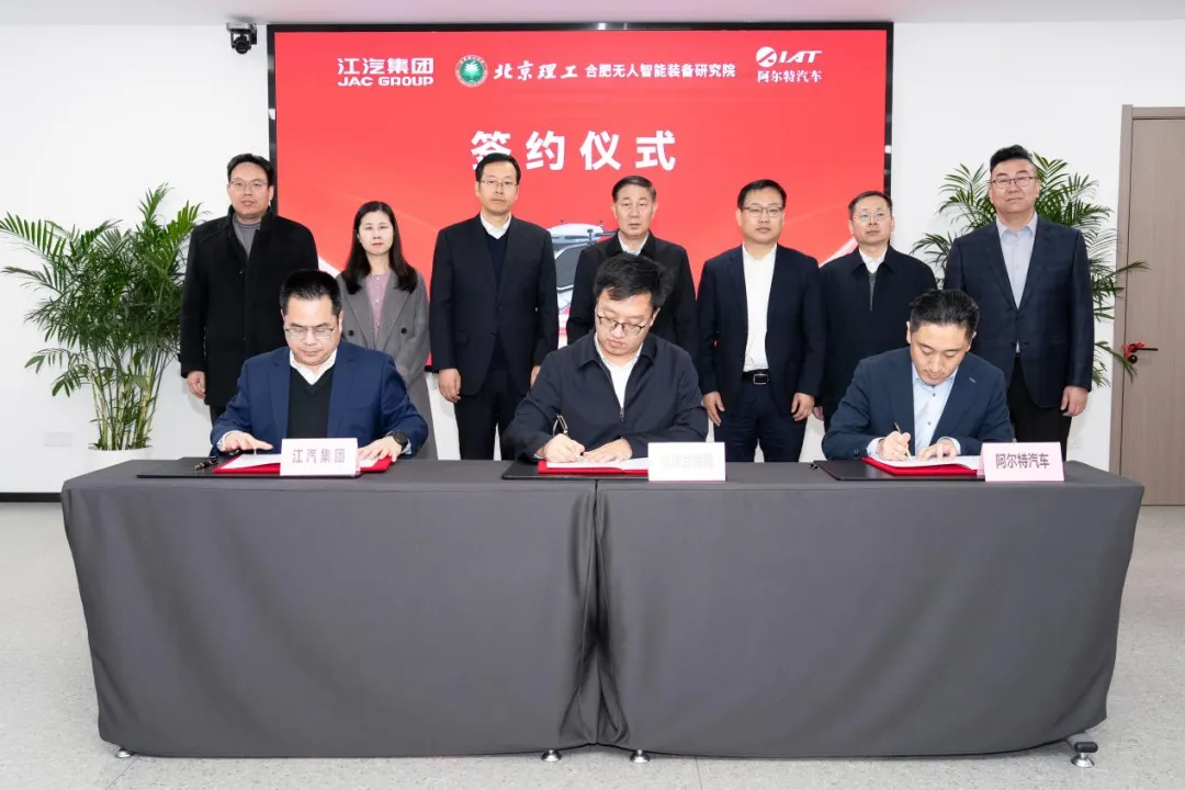 注:江汽集團控股公司副總經理宋華、北理合裝院院長楊超、阿爾特汽車總經理張立強代表三方在聯合實驗室合作協議簽約