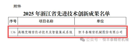近日,浙江省經(jīng)濟(jì)和信息化廳正式發(fā)布《關(guān)于公布2025年浙江省先進(jìn)技術(shù)創(chuàng)新成果名單的通知》。經(jīng)申報(bào)推薦、專家嚴(yán)格評(píng)審及社會(huì)公示等多輪遴選,全省共認(rèn)定156項(xiàng)具有顯著行業(yè)引領(lǐng)性與技術(shù)前瞻性的創(chuàng)新成果。恒豐泰自主研發(fā)的“高精度精密傳動(dòng)技術(shù)及智能集成系統(tǒng)”成功入選,彰顯了公司在精密傳動(dòng)領(lǐng)域的領(lǐng)先地位。
