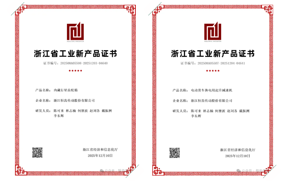 2025年12月10日,浙江恒齒傳動股份有限公司自主研發的 “內藏行星齒輪箱” 與 “電動貨車換電用起升減速機” 雙雙通過專家驗收,榮獲 “浙江省工業新產品” 認定。這不僅是企業在產品創新道路上的重要里程碑,也標志著恒齒傳動在高端傳動裝備自主研發與產業化方面邁出了堅實一步。