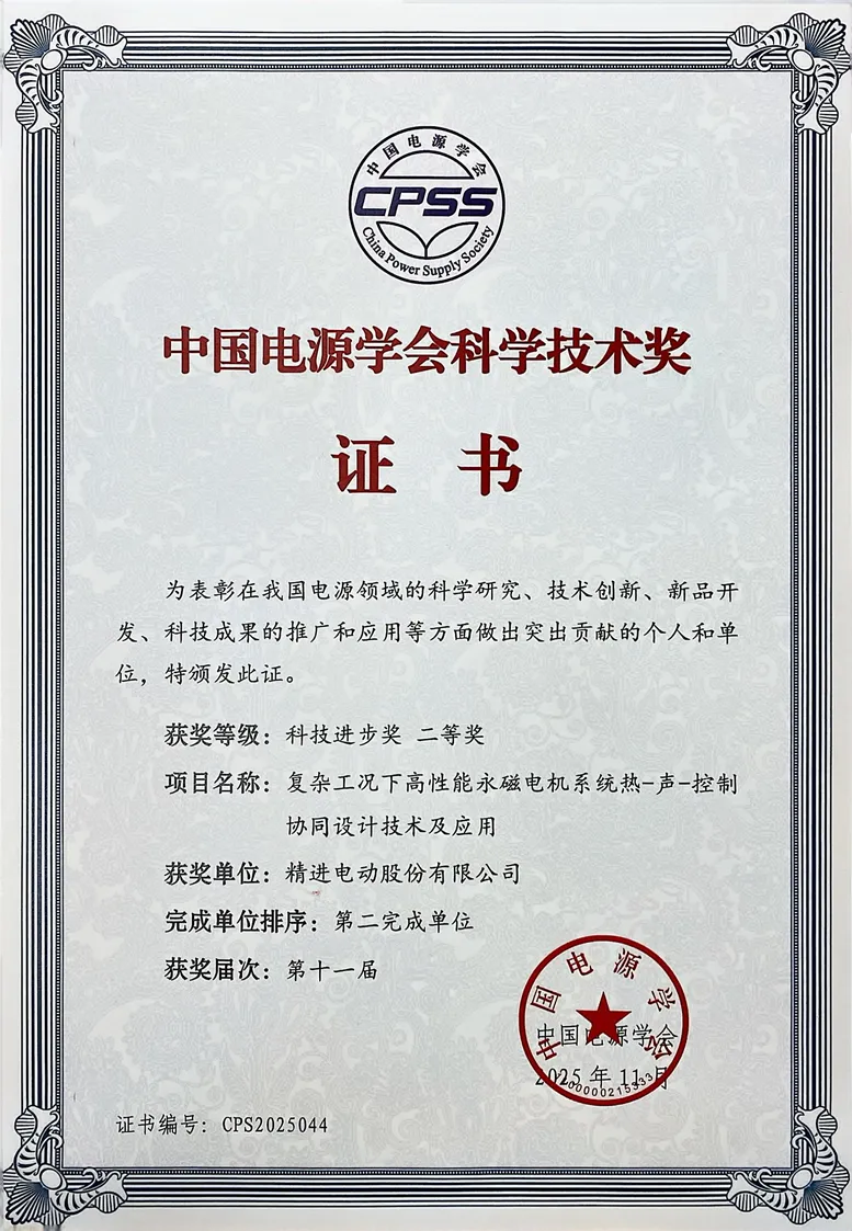 創新引領是精進電動一貫秉承的發展理念,并持續得到行業的高度認可。2025年度,精進電動在先后獲得中國汽車工程學會技術發明獎、北京市科學技術進步獎之后,又與北京交通大學等單位組成項目團隊,榮獲中國電源學會科技進步二等獎。