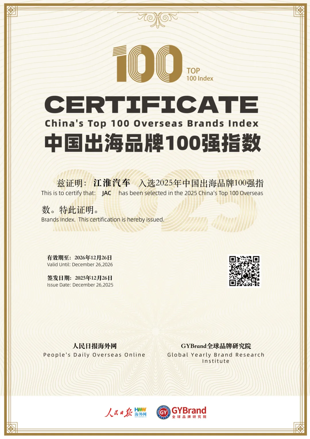 作為中國汽車產業出海的中堅力量,江淮汽車長期深耕海外市場,始終堅持以高品質產品與可持續發展理念拓展全球版圖。此次入選“中國出海品牌100強”,標志著其品牌國際影響力、市場運營能力及創新能力獲得權威認可。該榜單由人民日報海外網與GYBrand全球品牌研究院共同評定,覆蓋品牌海外知名度、市場占有率及創新能力等多個核心維度,極具行業權威性與公信力,有效期至2026年12月26日。
