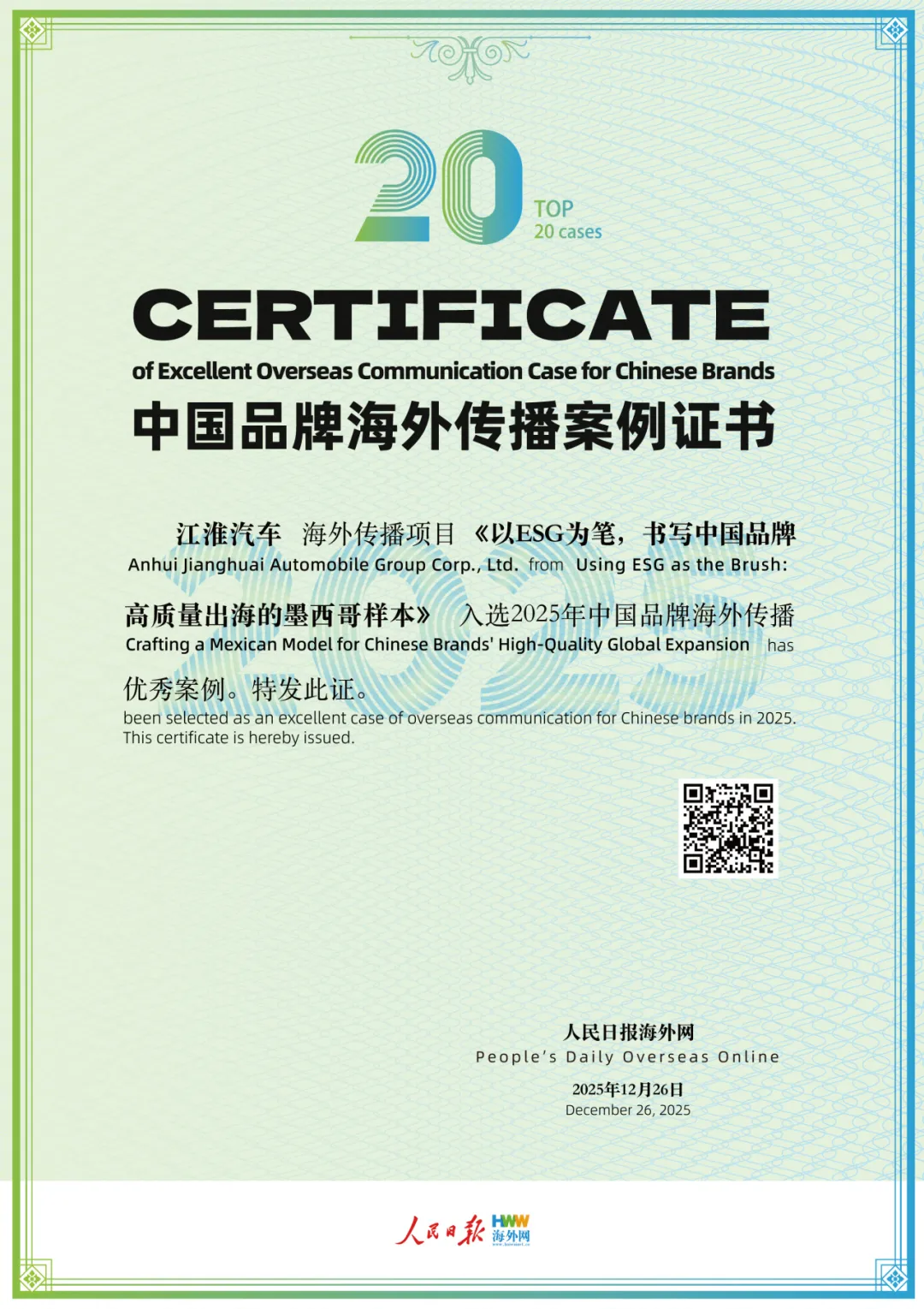 2025年12月26日,由人民日報海外網、中華環保聯合會與中國質量認證中心聯合主辦的“第三屆中國品牌形象海外傳播論壇暨2025中國企業ESG藍皮書發布會”在人民日報社隆重舉行。江淮汽車憑借其在海外市場的卓越表現以及在ESG領域的創新實踐一舉斬獲雙重榮譽:成功入選“2025中國出海品牌100強指數”,其海外傳播項目《以ESG為筆,書寫中國品牌高質量出海的墨西哥樣本》獲評“2025中國品牌海外傳播優秀案例”,彰顯了中國汽車品牌在全球化進程中的綜合實力與可持續發展責任擔當。