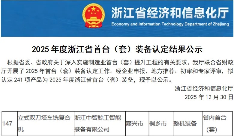 近日,2025 年度浙江省首臺(tái)(套)裝備認(rèn)定結(jié)果正式公示,由浙江中智鯨工智能裝備有限公司自主研發(fā)的立式雙刀塔車(chē)銑復(fù)合機(jī)成功入選,獲評(píng)省內(nèi)首臺(tái)(套)整機(jī)裝備!
