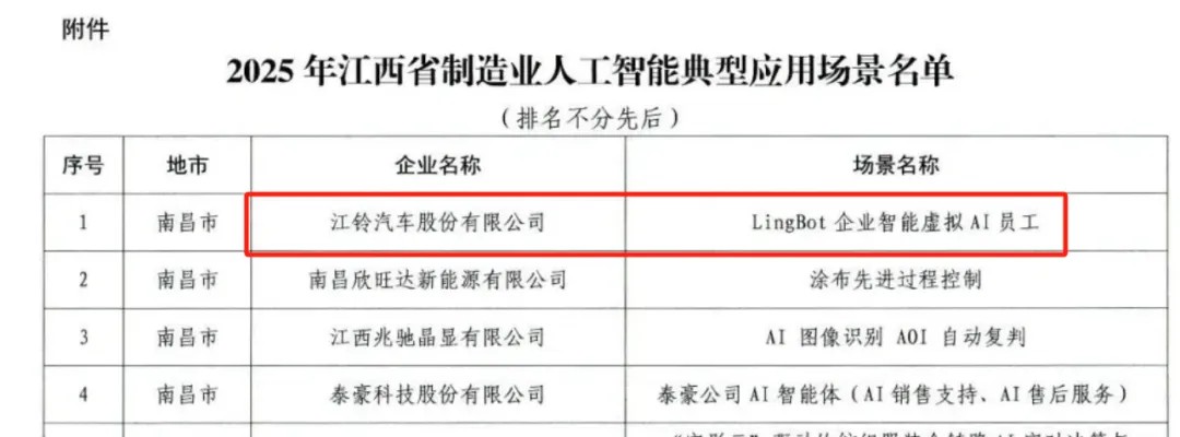 近日,江西省工業和信息化廳正式公布《2025年制造業人工智能典型應用場景名單》。江鈴汽車股份有限公司的“LingBot企業智能虛擬AI員工”場景成功入選,標志著江鈴在推動人工智能與先進制造業深度融合方面取得新突破。