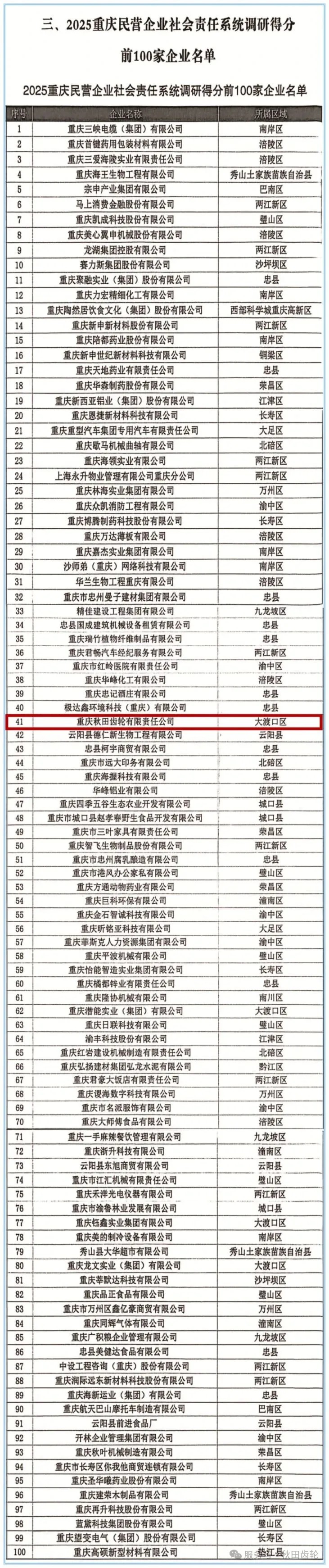 近日,2025重慶民營企業社會責任系統調研結果正式揭曉,重慶秋田齒輪有限責任公司成功入圍調研得分前100家企業名單,本名單企業均為重慶市民營企業社會責任評價三星級及以上企業。